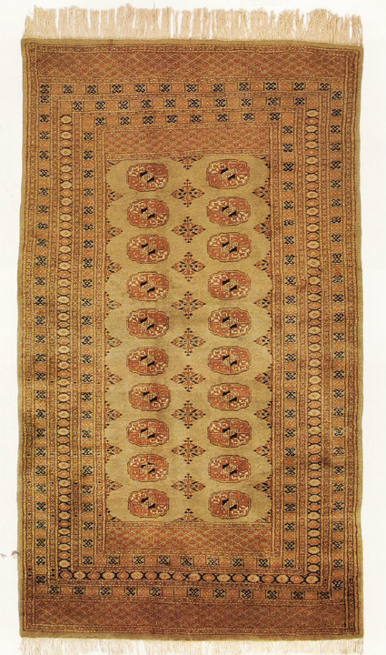 These rugs with the Bokhara oriental design are usually woven by the Turkomen of northern Iran (Yomud tribes). These are mostly in the Tekke design but can be characteristically Yomud.
