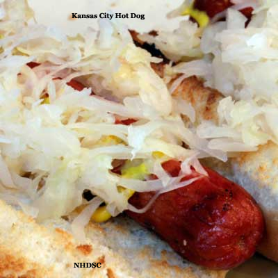 The Kansas City Hot Dog is served with sauerkraut and melted Swiss cheese on a sesame seed bun.